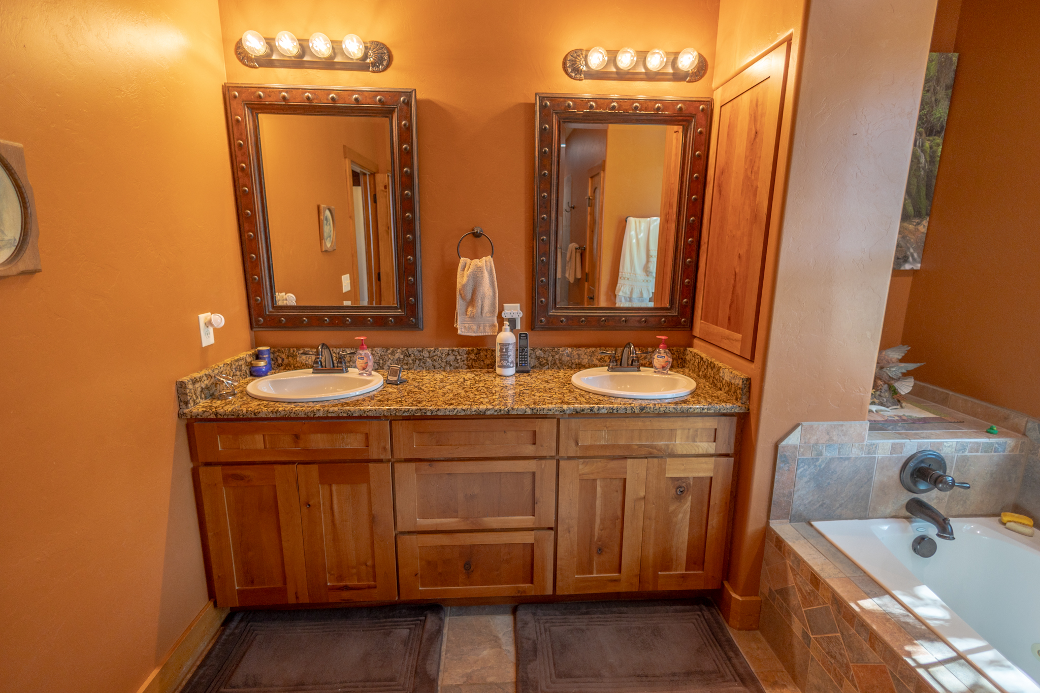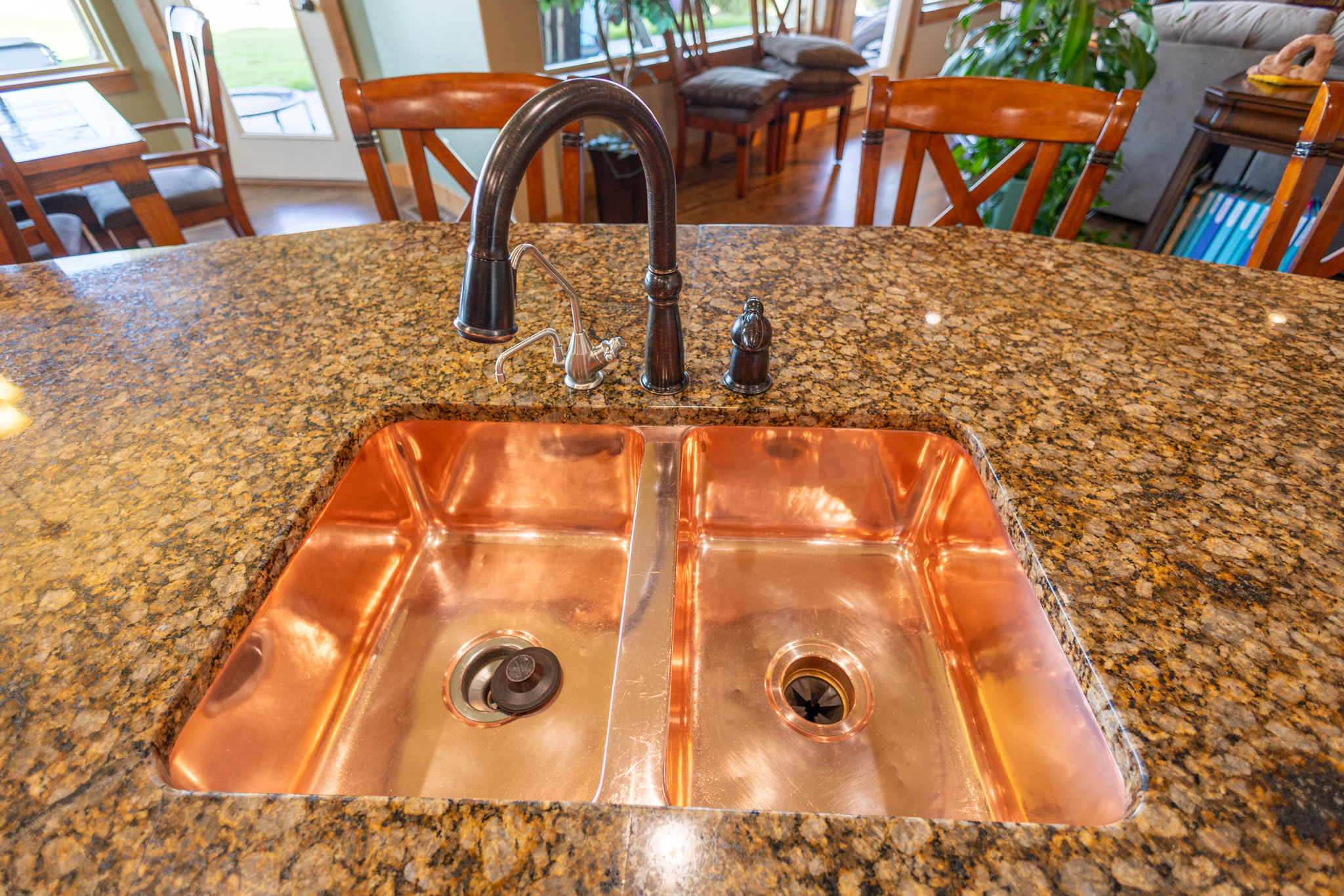 - Custom kitchen with knotty cherry cabinets, granite countertops, and a copper farmhouse sink