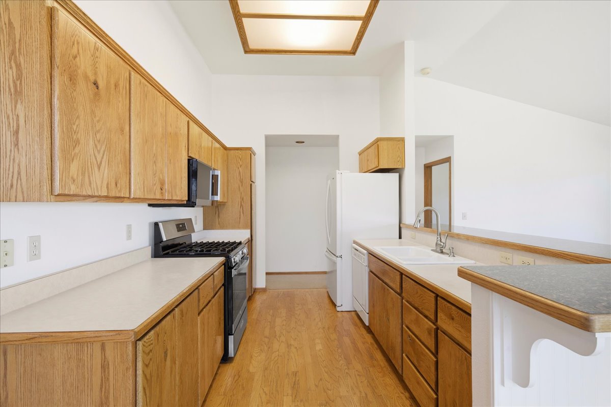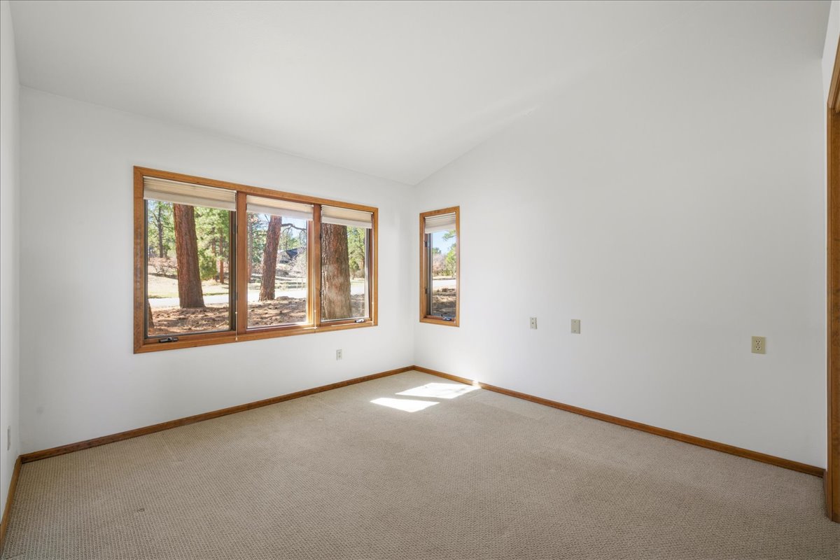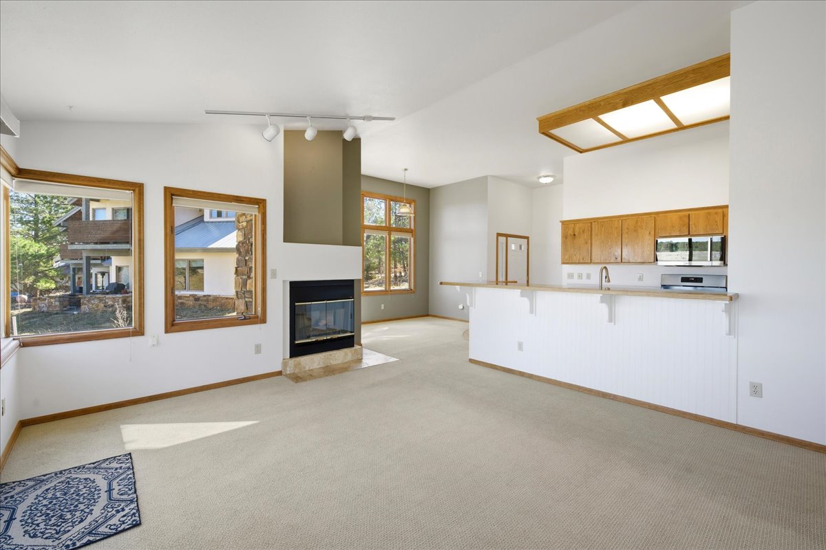Inside, you’ll find a thoughtfully designed layout with vaulted ceilings, abundant natural light, and warm mountain finishes including stone accents, cedar trim, and a cozy gas fireplace. The open kitchen, dining, and living area is ideal for relaxing or entertaining, with quality cabinetry, included appliances, gas range, and new microwave. Large windows frame beautiful course views, bringing the outdoors in.