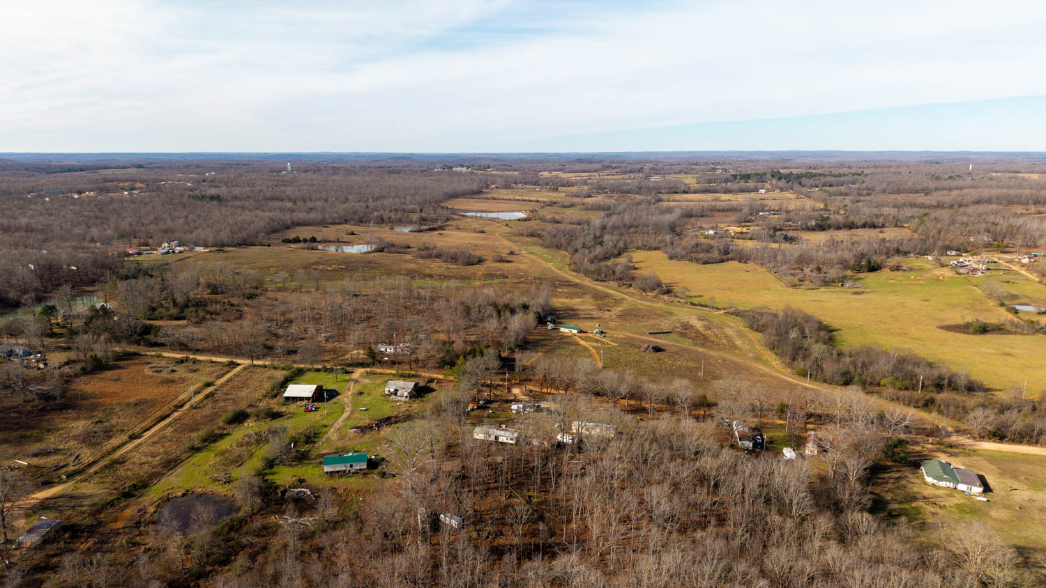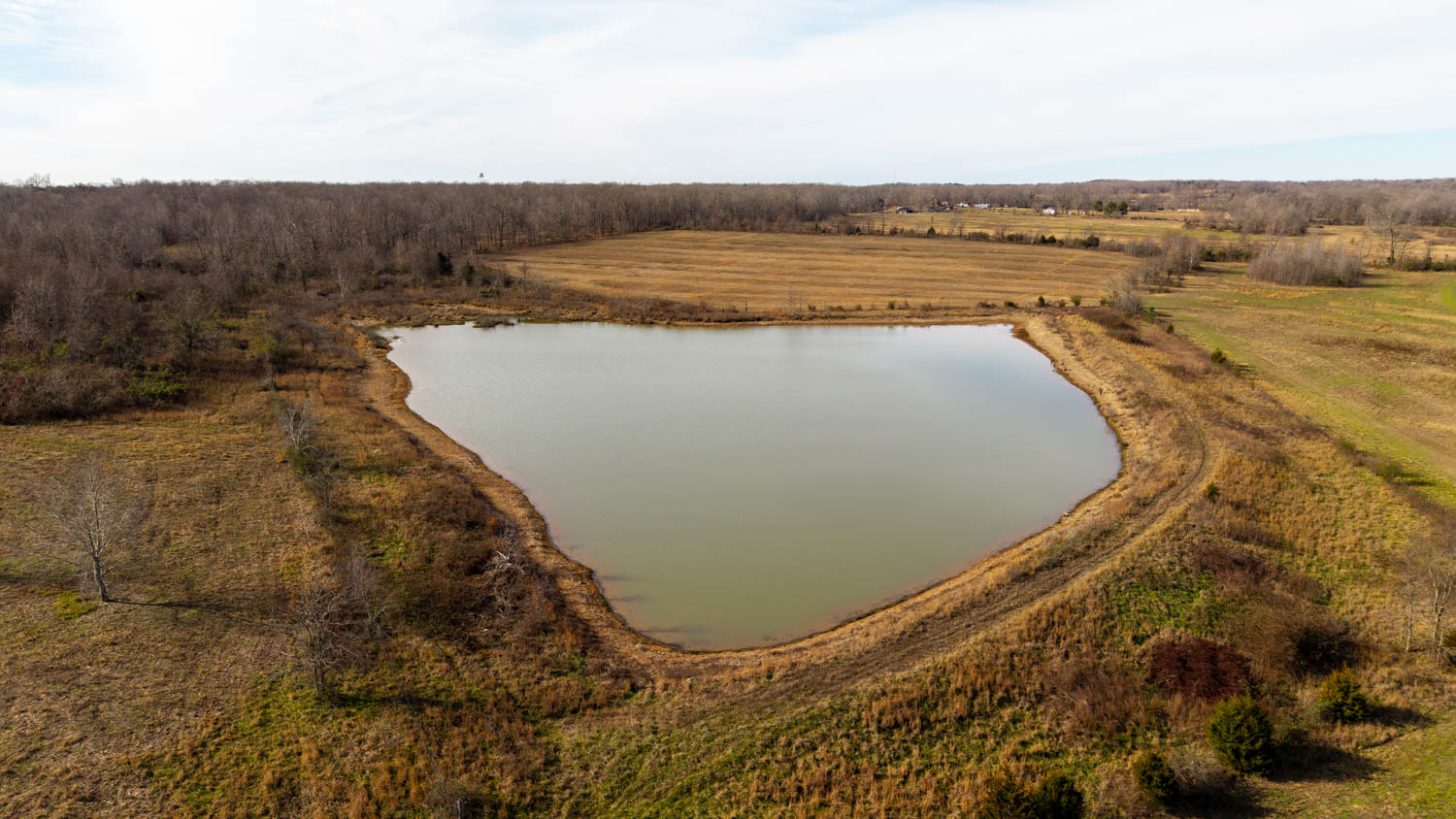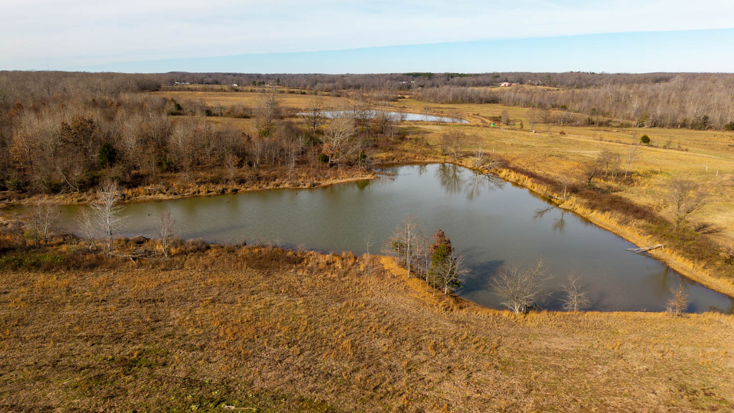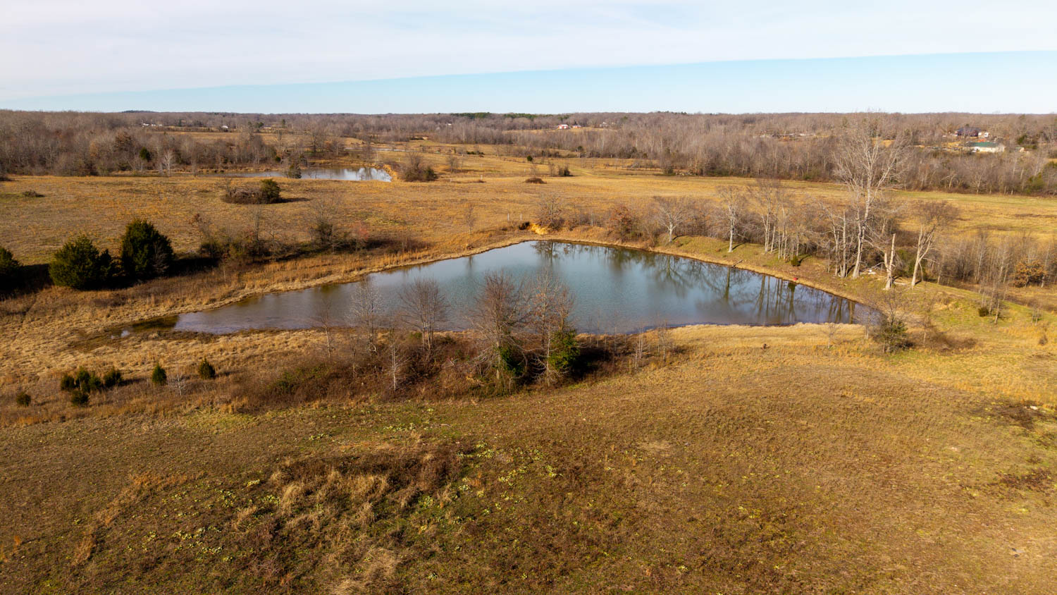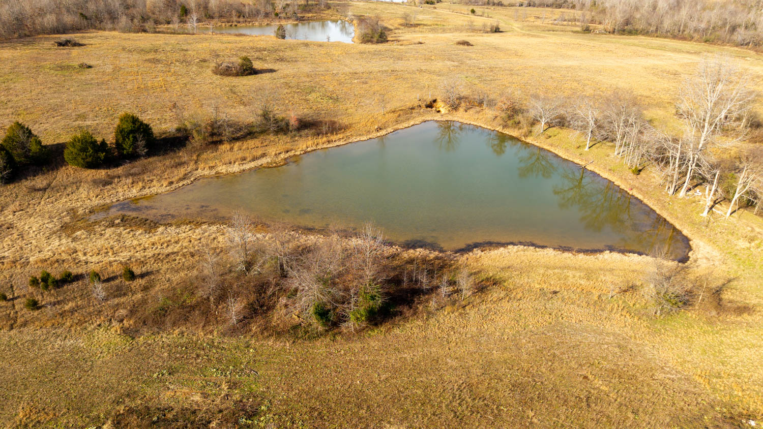 The land consists of gently rolling bottom ground with no steep areas making it highly usable and productive. Approximately 90% of the property is open, making it ideal for livestock grazing and hay production. A wet-weather creek runs through the center of the farm for over a mile, supplying natural water and serving as a strong wildlife travel corridor. Five ponds are located across the property, three stocked with bass, including two approximately 1.5 acres each and a larger pond of around 4 acres, providing ample water for cattle, wildlife, and recreation.