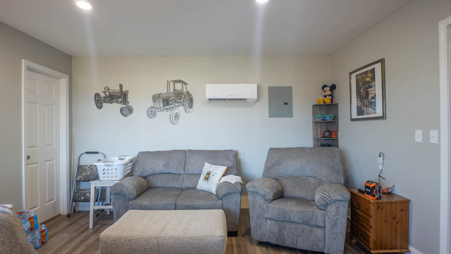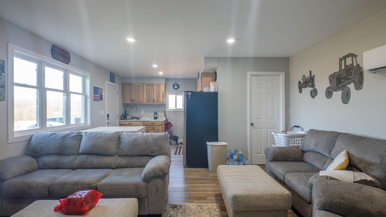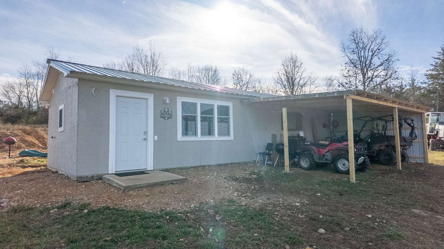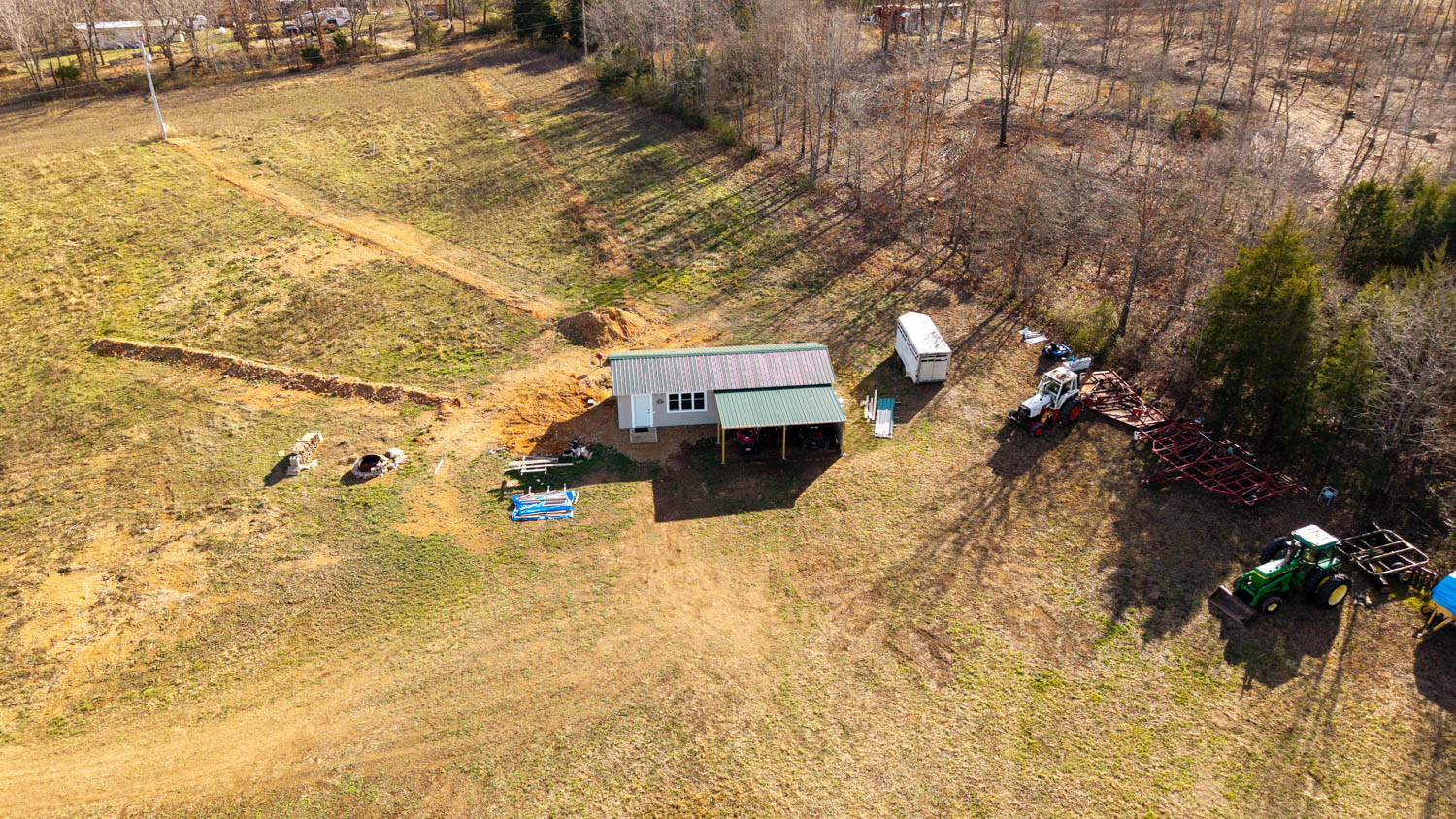 Improvements include a 1-bedroom, 1-bath cabin with a spacious bedroom built in 2022, with the kitchen, living area, and bathroom added in 2025. The kitchen features a stove, refrigerator, and hickory cabinets. A two-bay lean-to provides covered storage or equipment space. Optional farm equipment is available for purchase, making this a versatile opportunity for grazing, hay production, hunting, or a combination of all three.
