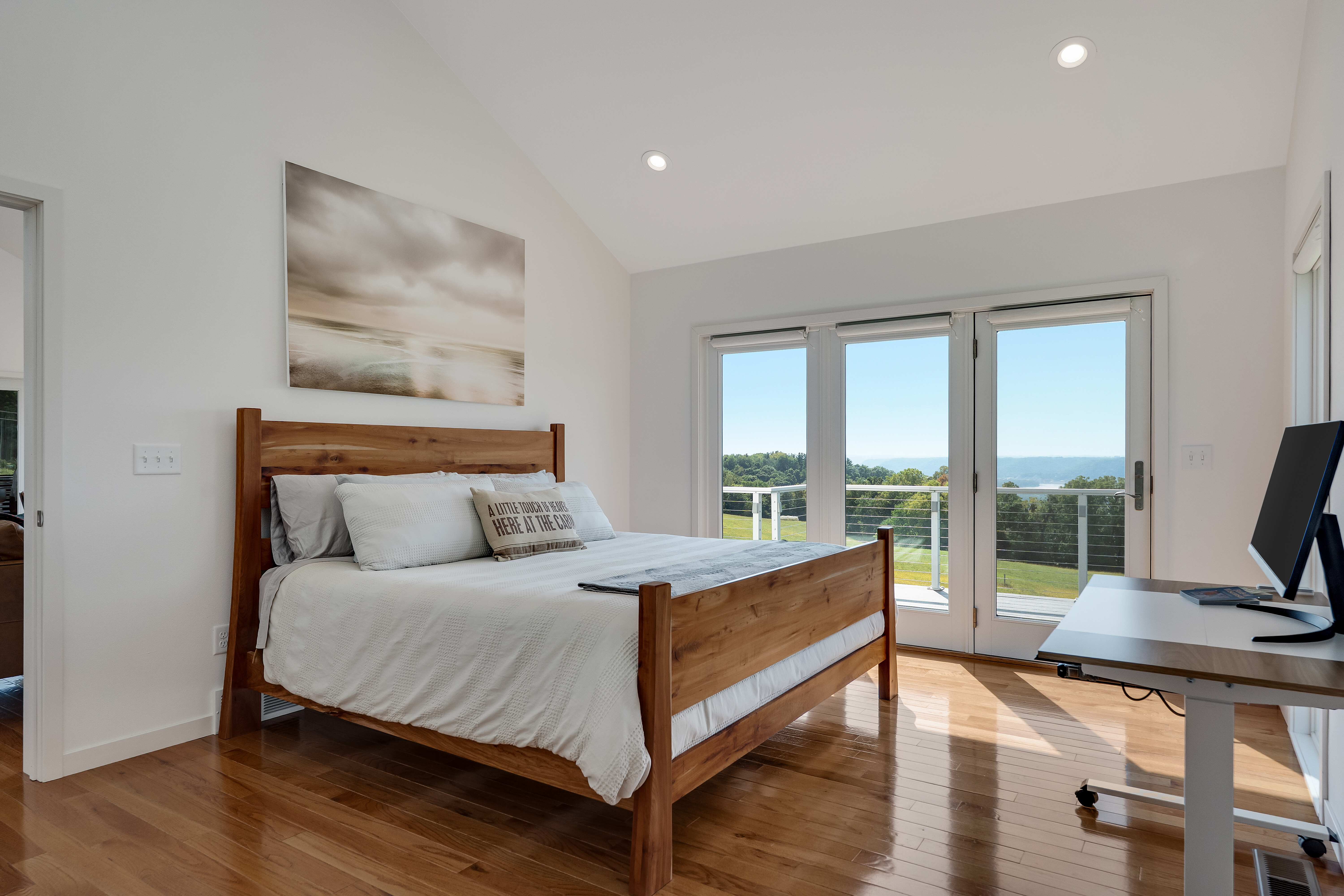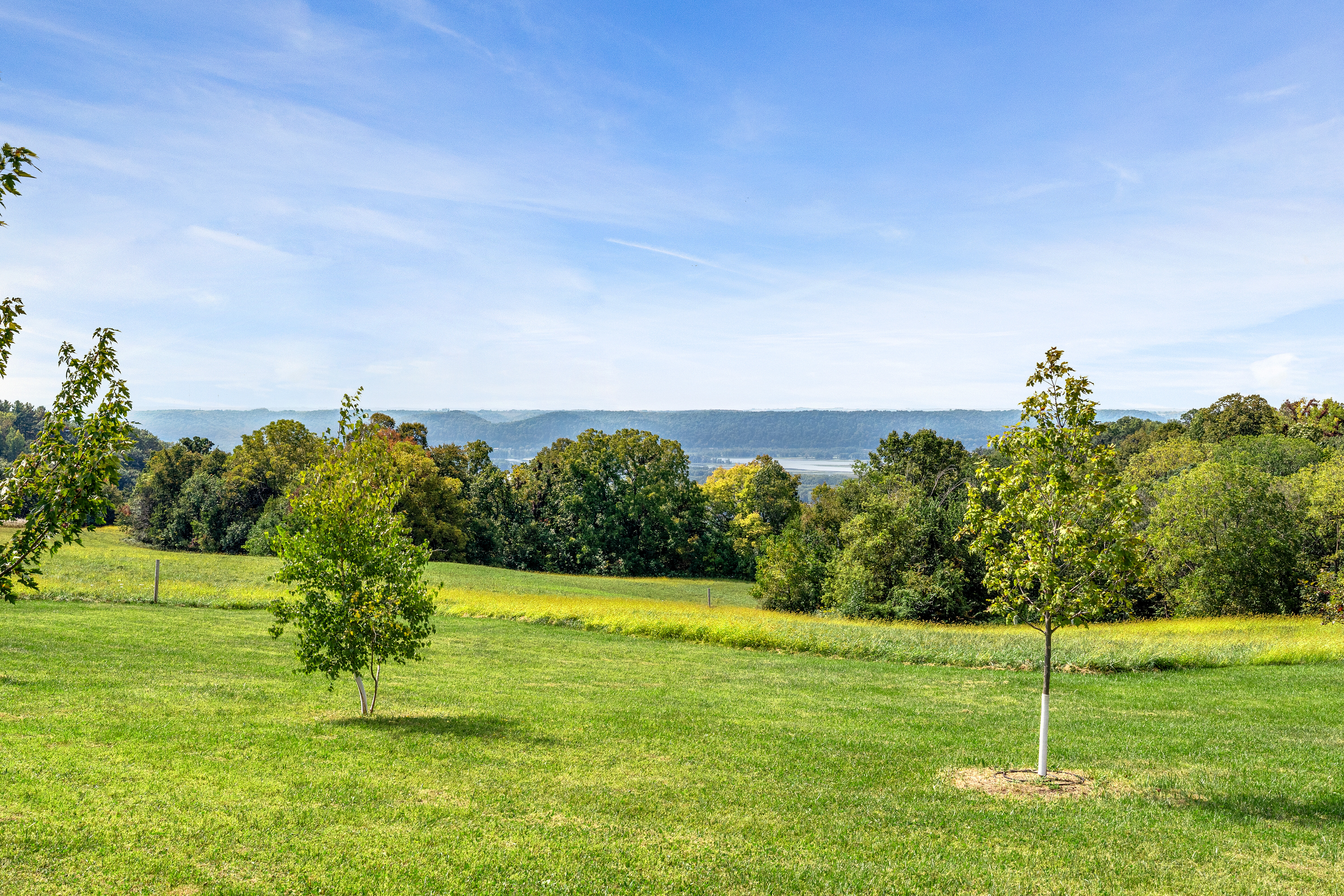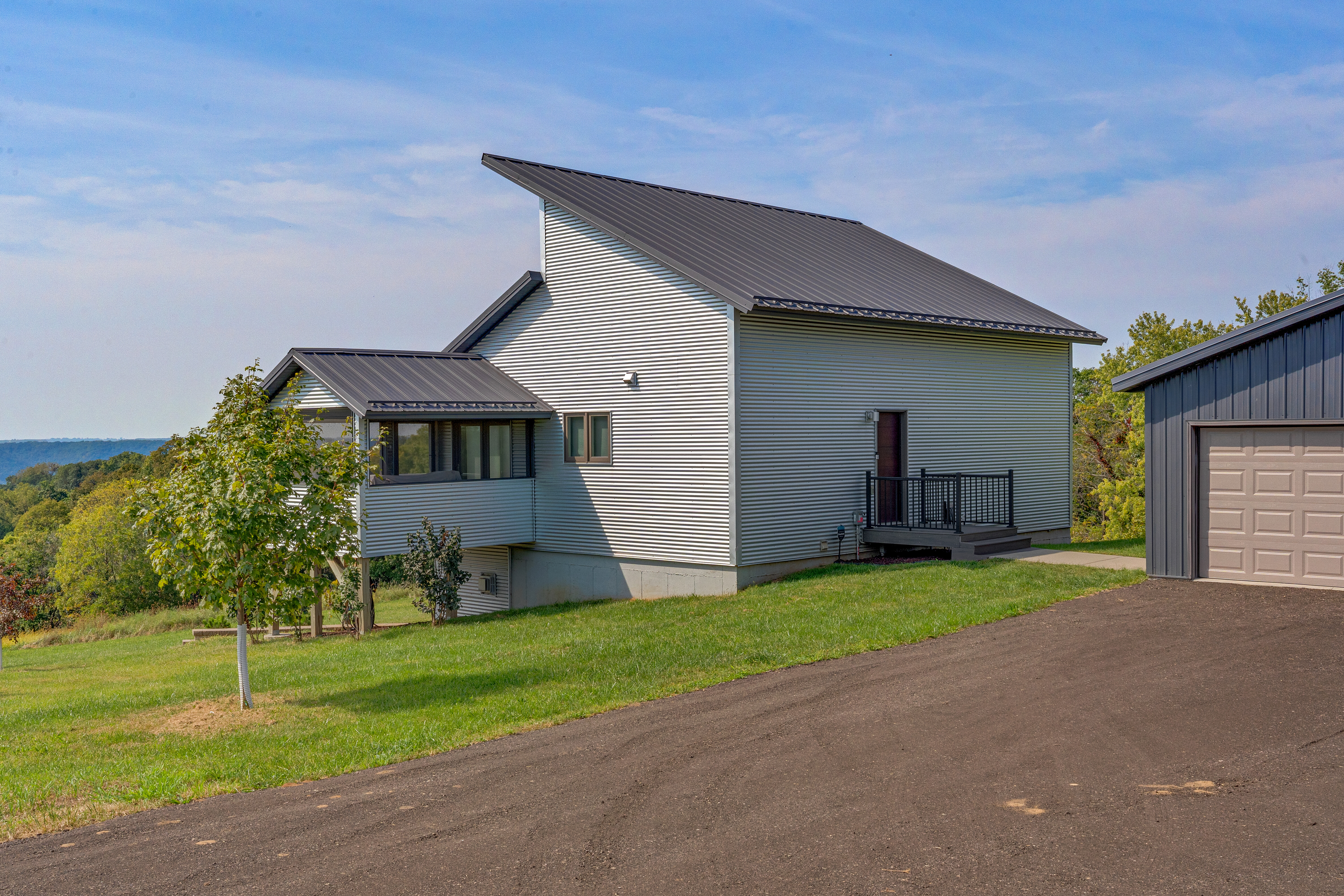 This beautiful, passive solar home was designed to capture the grand views of the Mississippi River valley from every room. It features hardwood floors, an 18' vaulted ceiling, Amish-made cabinetry, granite countertops, automatic blinds, two gas fireplaces, and abundant natural light. There is fiber optic to the house. Work remotely while watching the great bird migrations of the Upper Mississippi Flyway. Each bedroom has a private, full bathroom and walk-in closet. Relax on the 40'x5' low-maintenance deck; enjoy morning coffee from the screened-in porch. Every vantage point of this home opens to nature. The 36'x24' garage includes 2 extra rooms. The gently sloped, usable land has fruit trees, space for a vineyard, woods, and open fields. Solar panels offset the electrical costs. Additional access to 33.56 acres of common shared land. Excellent location for work, relaxation, and fun.
