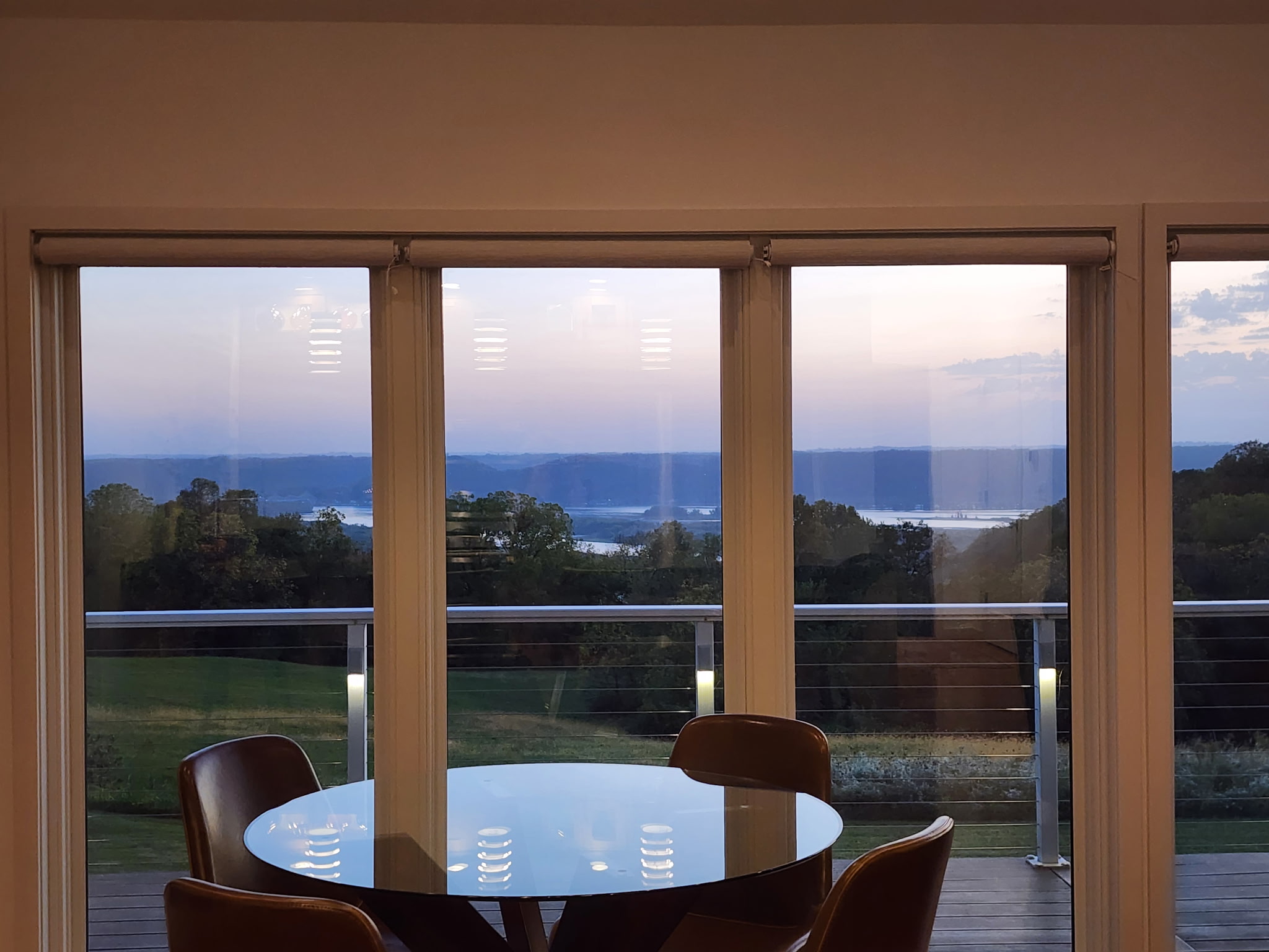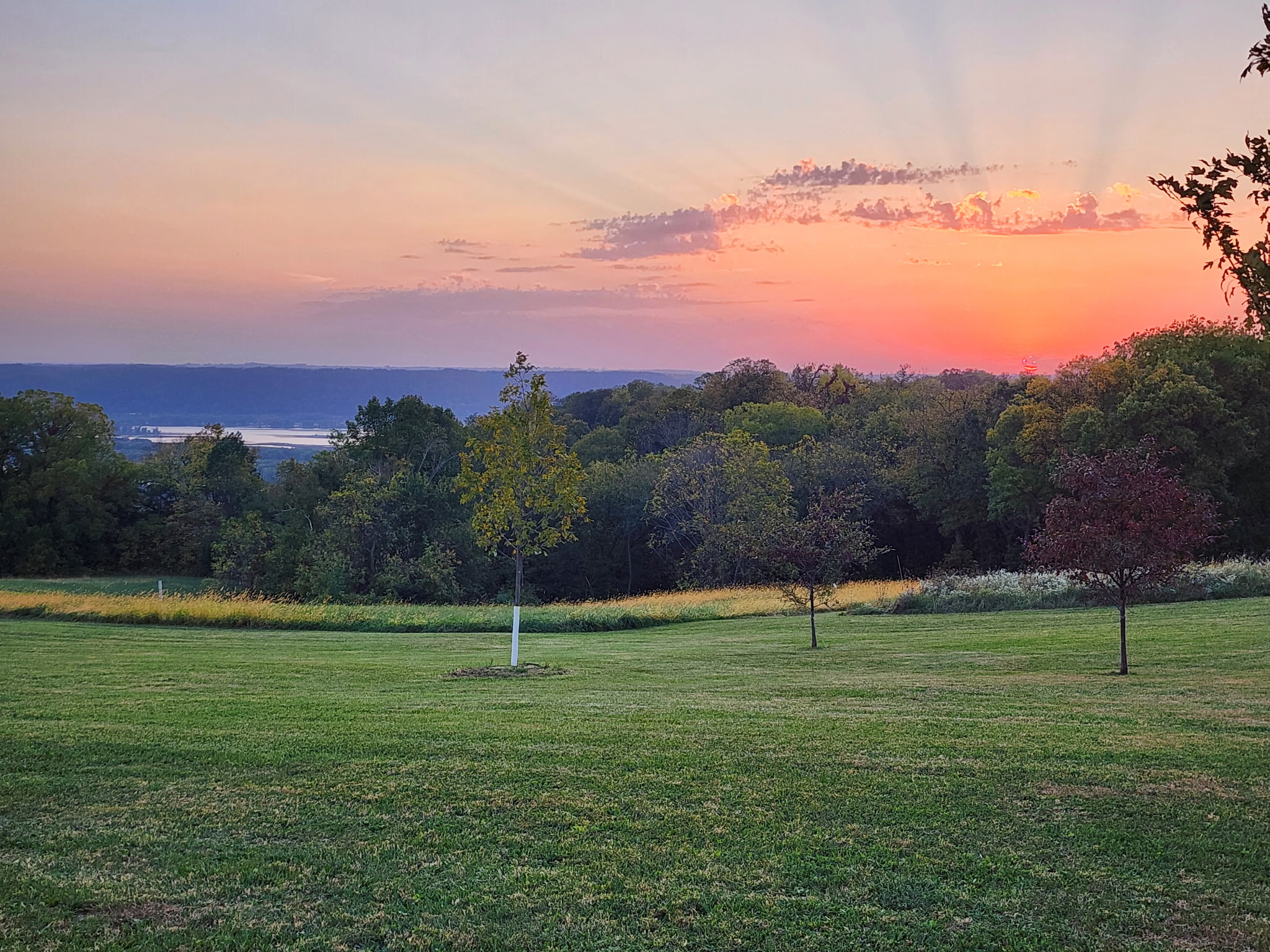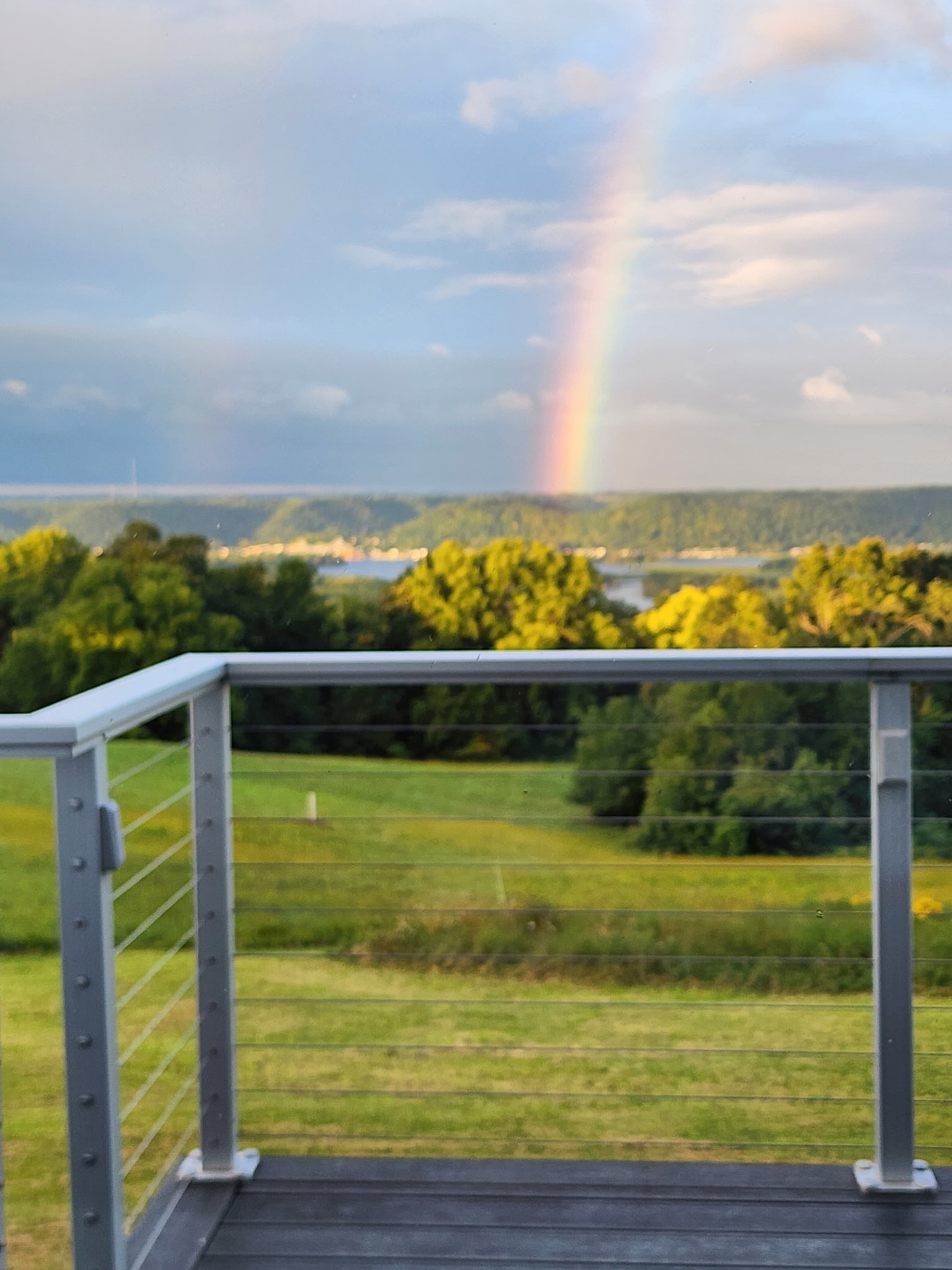 This beautiful, passive solar home was designed to capture the grand views of the Mississippi River valley from every room. It features hardwood floors, an 18' vaulted ceiling, Amish-made cabinetry, granite countertops, automatic blinds, two gas fireplaces, and abundant natural light. There is fiber optic to the house. Work remotely while watching the great bird migrations of the Upper Mississippi Flyway. Each bedroom has a private, full bathroom and walk-in closet. Relax on the 40'x5' low-maintenance deck; enjoy morning coffee from the screened-in porch. Every vantage point of this home opens to nature. The 36'x24' garage includes 2 extra rooms. The gently sloped, usable land has fruit trees, space for a vineyard, woods, and open fields. Solar panels offset the electrical costs. Additional access to 33.56 acres of common shared land. Excellent location for work, relaxation, and fun.
